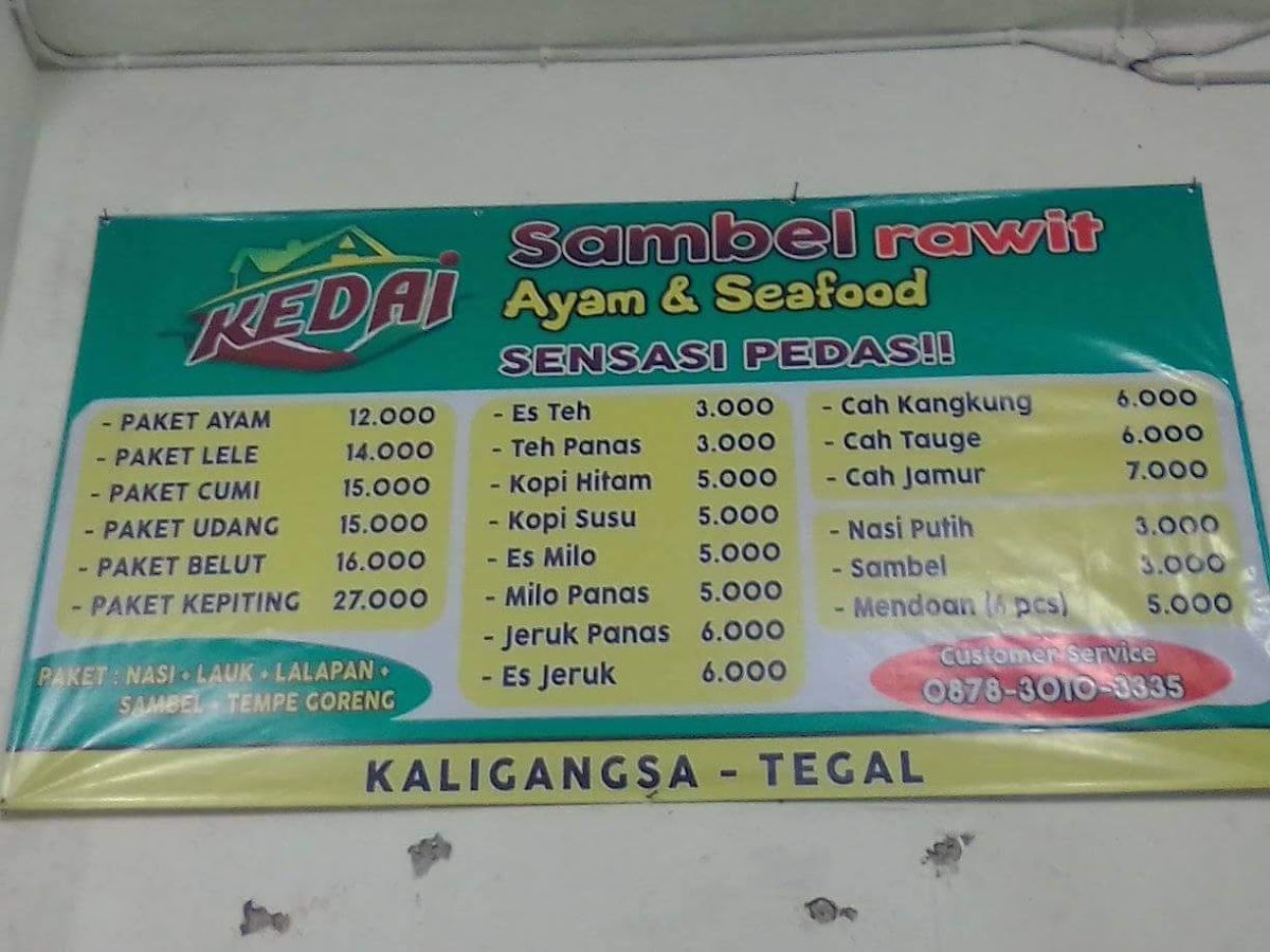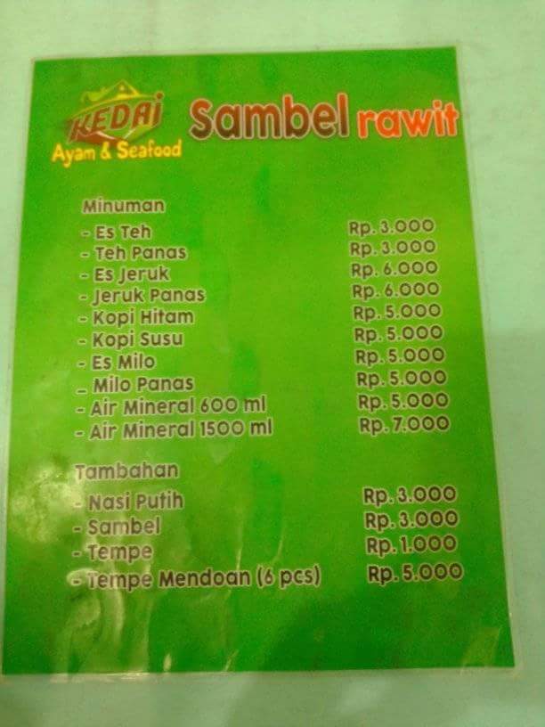 Welcome to Kedai Sambel Rawit (Ayam & Seafood), a culinary gem located in Kota Tegal, Jawa Tengah. This restaurant specializes in mouthwatering dishes featuring chicken (ayam) and seafood, all infused with their signature sambal, renowned for its exceptional flavors and delightful heat.
